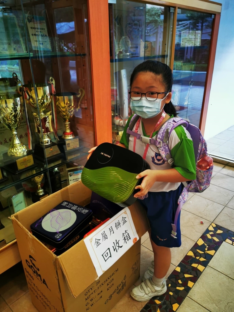 本校積極推廣環保教育及減廢惜物。歡度中秋佳節時,月餅當然是不可缺少的應節食品,但亦會產生大量垃圾,包括月餅盒。本校舉辦中秋月餅盒回收活動,鼓勵學生回收月餅盒(金屬),將資源循環再用,並減少使用即棄物料,為堆填區減輕壓力,共同度過一個歡欣的綠色中秋