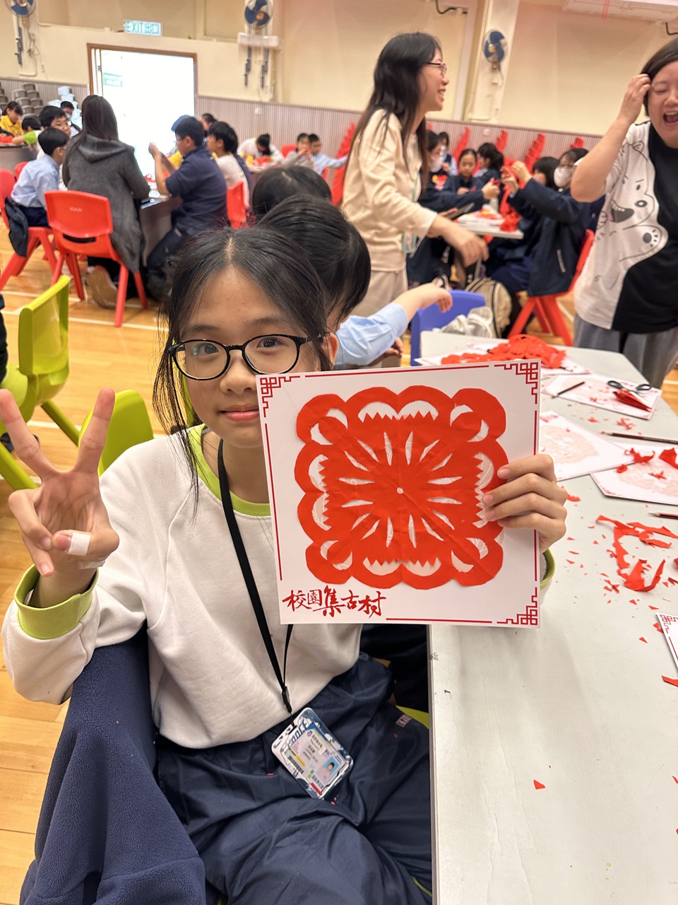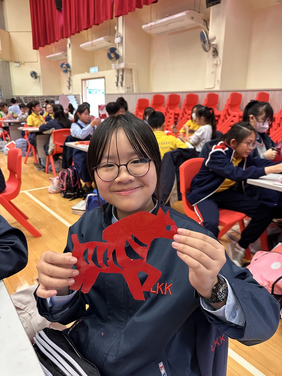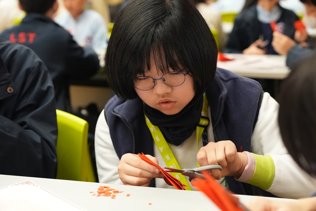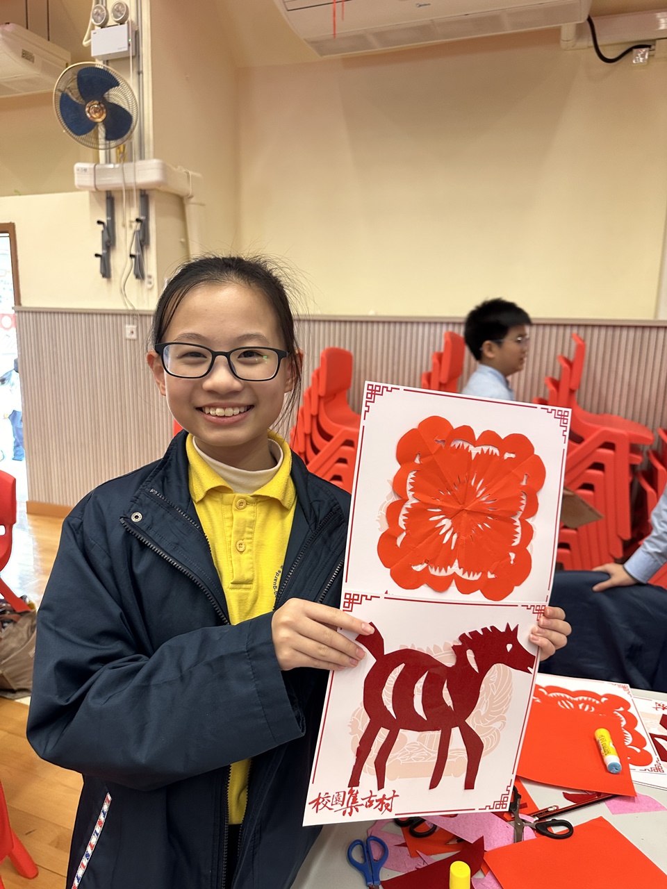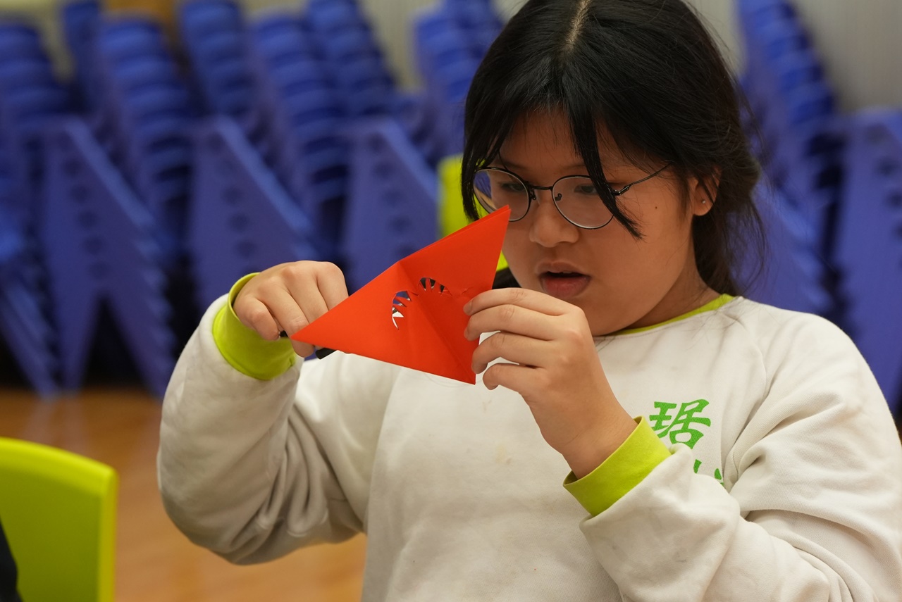 活動當天,學生親手剪出兩張剪紙圖案,第一張剪紙是窗花圖案,學生需剪出「軸對稱圖形」,當中的圖案需有2-4條對稱軸;第二張剪紙是配合馬年的小馬圖案。學生初步體驗剪紙的技巧,剪出獨一無二的圖案,他們表現投入,上了愉快的一課。