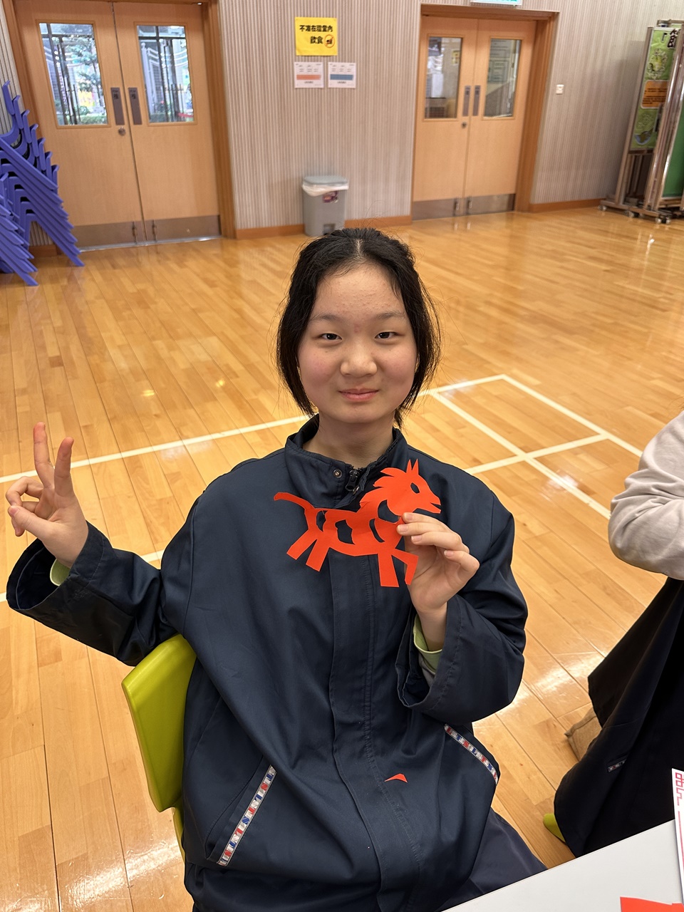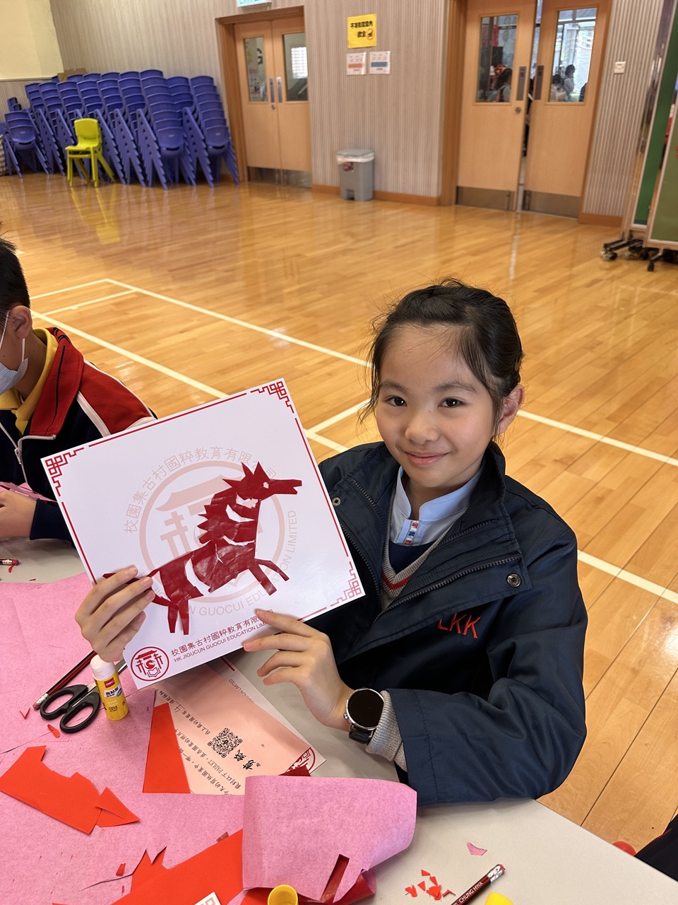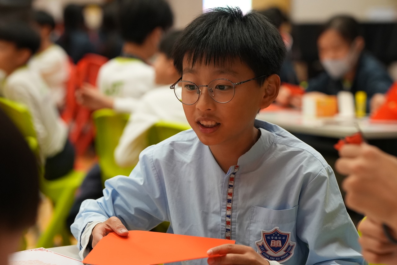 活動當天,學生親手剪出兩張剪紙圖案,第一張剪紙是窗花圖案,學生需剪出「軸對稱圖形」,當中的圖案需有2-4條對稱軸;第二張剪紙是配合馬年的小馬圖案。學生初步體驗剪紙的技巧,剪出獨一無二的圖案,他們表現投入,上了愉快的一課。