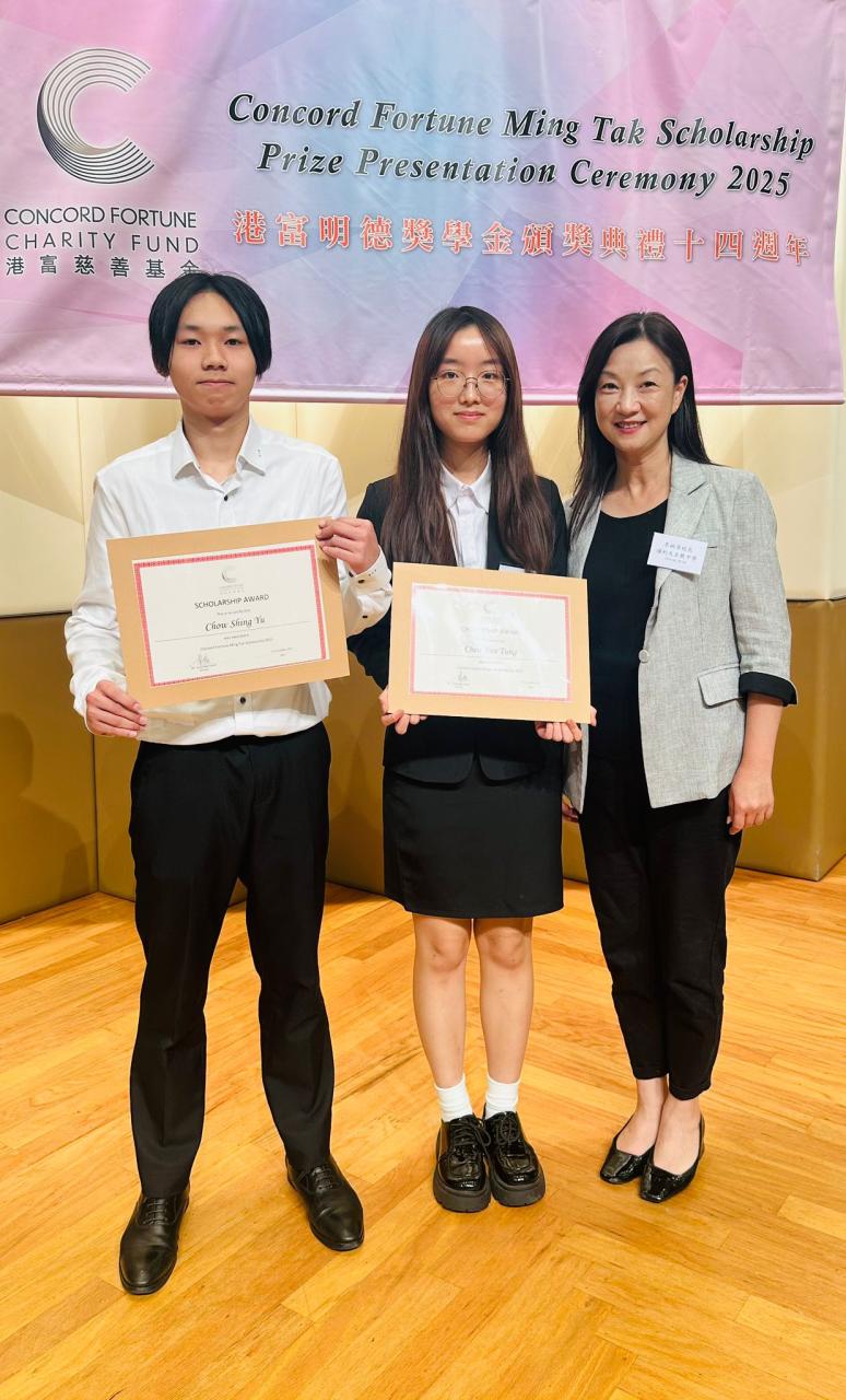 The Concord Fortune Ming Tak Scholarship provides capable students with limited financial resources an equal opportunity to pursue higher education. Congratulations to Chen Yan Tung and Chow Shing Yu for being awarded this scholarship, which covers most of their university tuition for four years. We extend our heartfelt thanks to the donor for their generous support in making this possible.