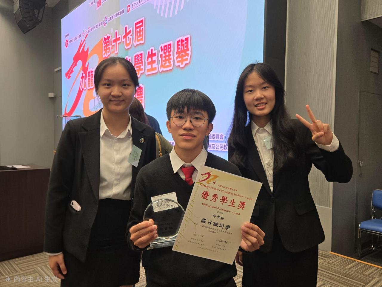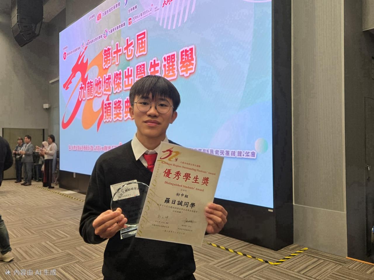 We proudly announce that Lo Yat Shing has received the Distinguished Student Award (Junior Section) at the 17th Kowloon Region Outstanding Students' Election! This event empowers students to recognize their potential and prepare for future challenges while fostering a passion for social responsibility. Participants engage in community service and enhance their awareness of our nation, ultimately broadening their global perspective.
